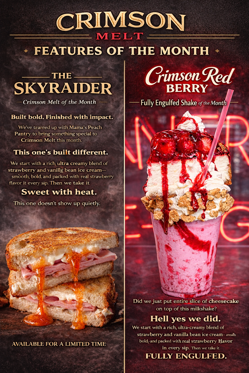 This month at Crimson Melt, we’re bringing bold flavor and over-the-top indulgence with two can’t-miss features. The Skyraider delivers a rich, smoky bite with layers of ham, four cheeses, and a sweet heat finish from habanero peach jam in partnership with Mama’s Peach Pantry. On the sweet side, the Crimson Red Berry Fully Engulfed Shake takes things to another level — blending strawberry and vanilla bean ice cream, loaded with a Golden Oreo rim, fresh strawberries, whipped cream, and topped with a full slice of our housemade “Fields of Strawberry” cheesecake. Two builds, one mission — go all in.